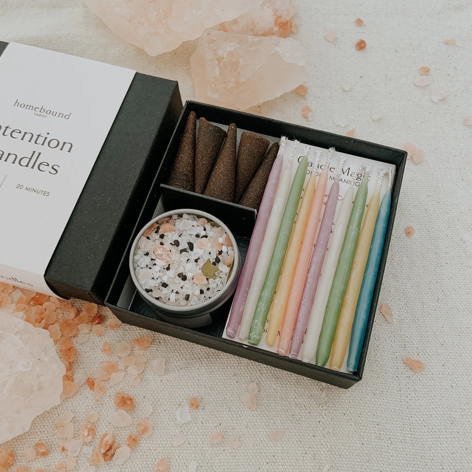 Each Intention Candle Kit includes 10 candles, a salt pot to safely burn your candles in, and 5 incense cones you can use to further elevate your moment.