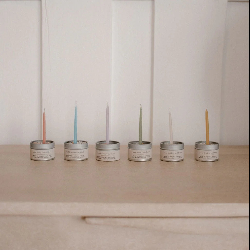One of the most special aspects of these kits is the salt crystal blend that keeps the candle secure and allows it to burn right down to its end. This carefully mixed blend of salts and is made up of coarse sea salt, Himalayan salt which increases feelings of peace and cleanses the space, black sand, and crushed bay leaves which, when burned lift your intentions into the world and calm your mind.