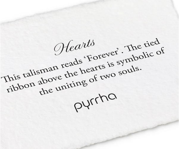 This talisman reads 'Forever'. The tied ribbon above the hearts is symbolic of the uniting of two souls.