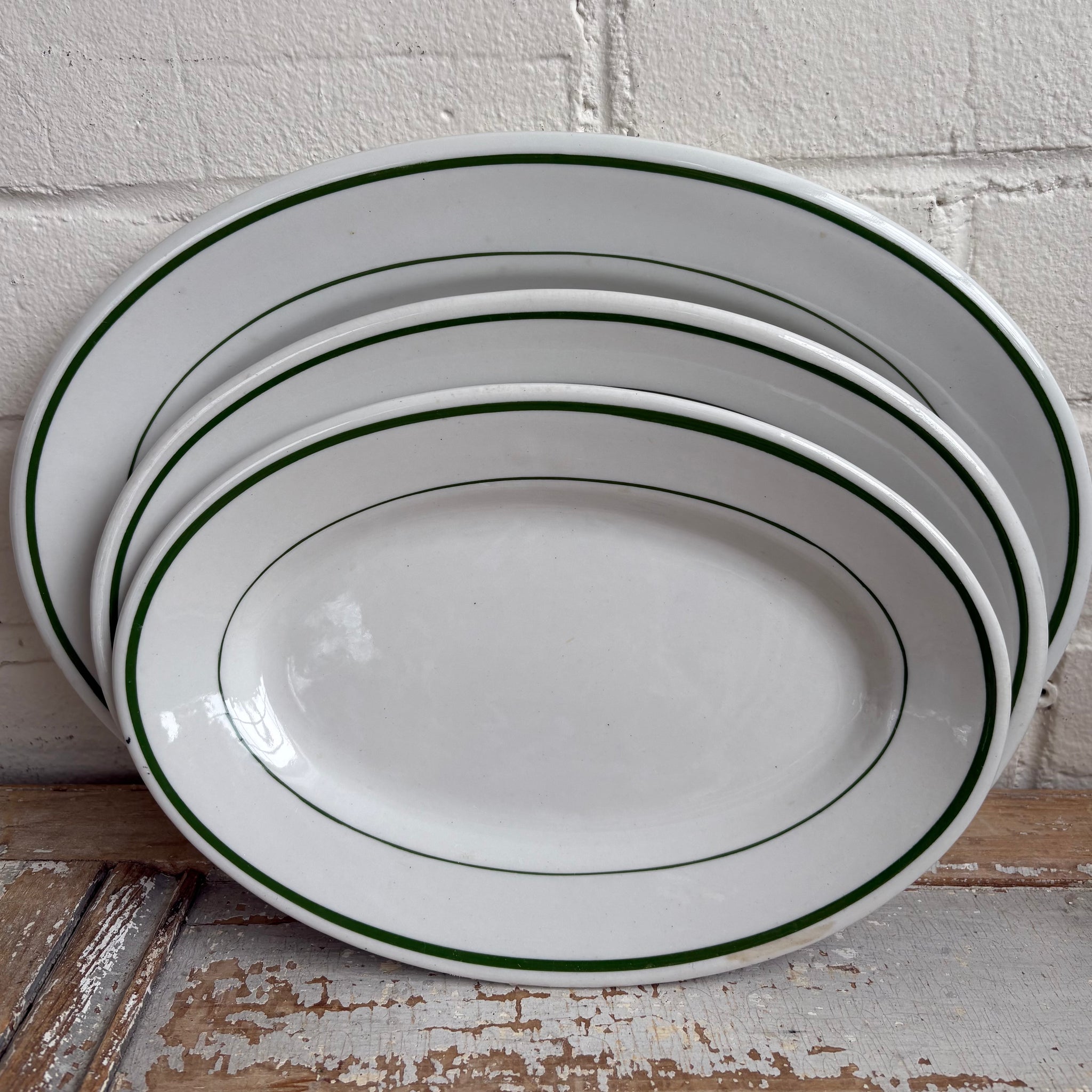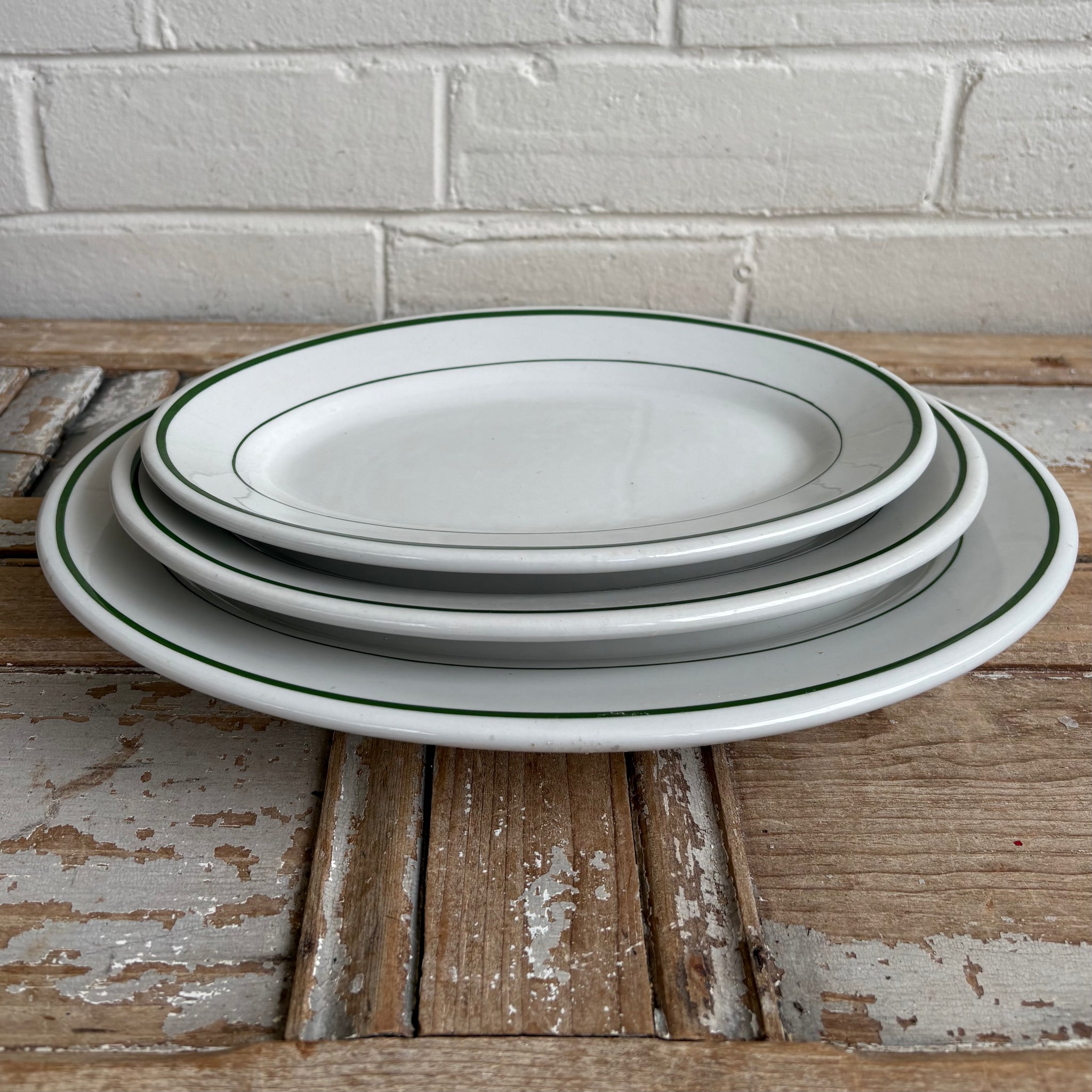 Classic American restaurantware by Buffalo China, these vintage oval platters feature the iconic green band design long associated with diners, hotels, and railway dining service. Made for heavy commercial use, they have a wonderful weight and clean, timeless look that works equally well for everyday serving or styled display.