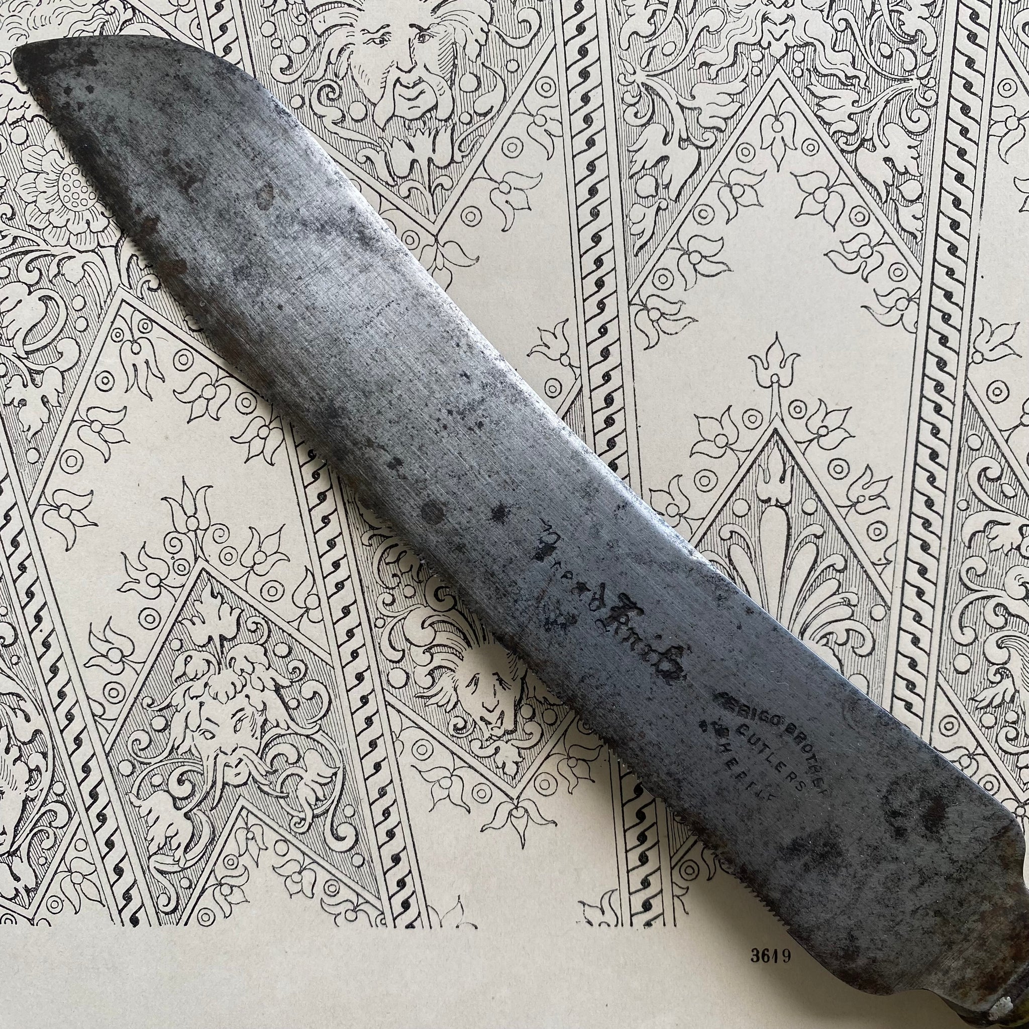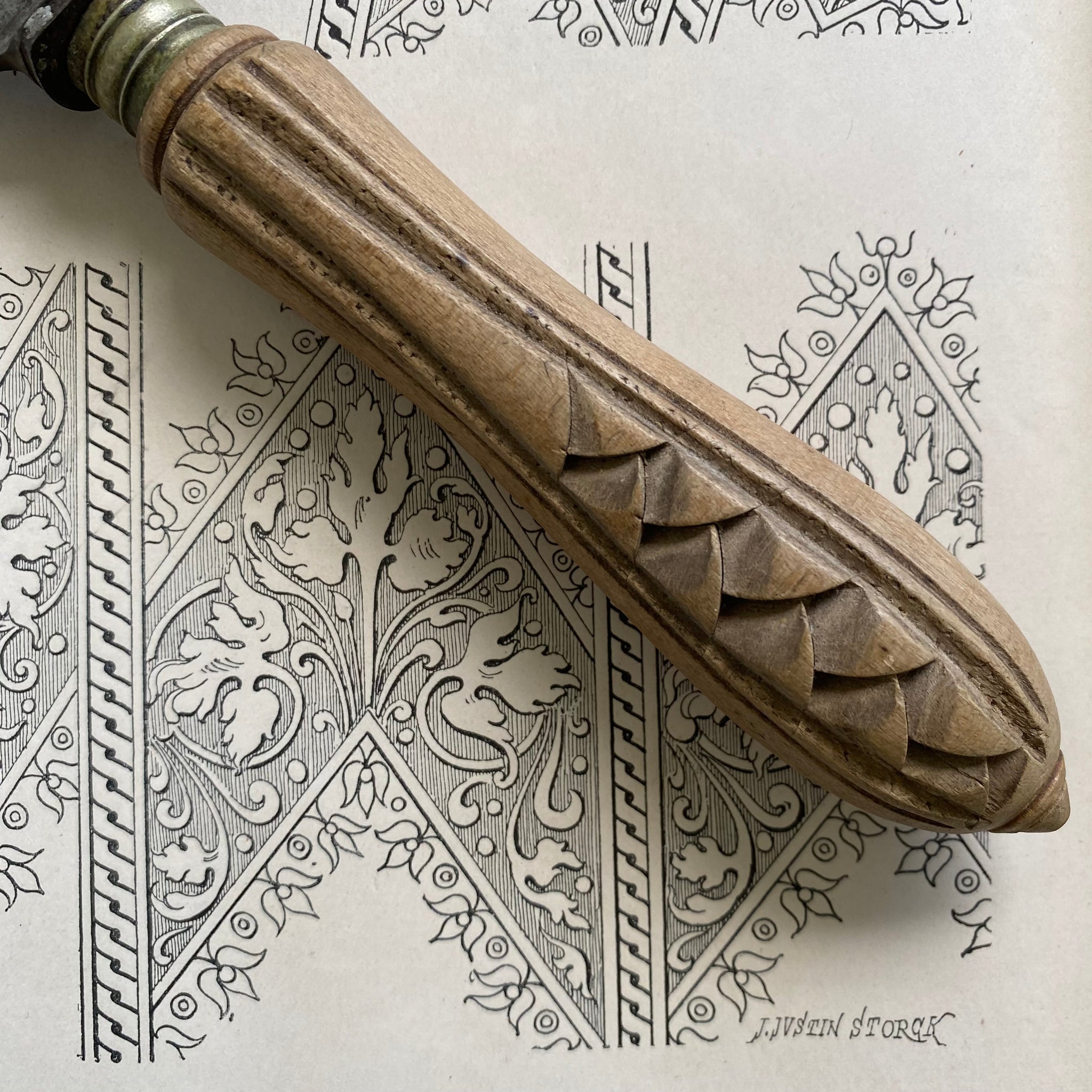 A Victorian, steel bread knife with a carved wooden handle. The handle is nicely carved with ears of wheat. It dates from c.1880. It is in good condition and marked Perigo Bros. Sheffield. Perigo Brothers, Sheffield, England) were noted 19th-century cutlery manufacturers based in Sheffield. By 1876, John Perigo was producing a wide range of table cutlery, including knives for everyday use.