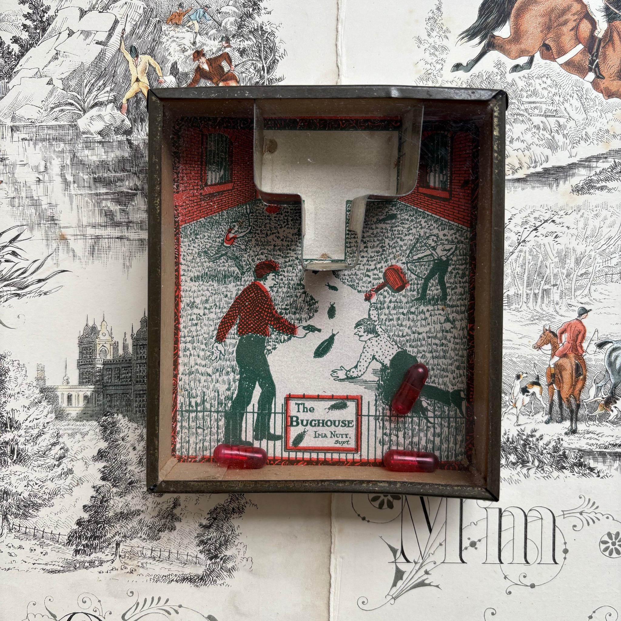 Whimsical and slightly mischievous — guide the bugs into the right places while admiring the humorous period illustration.