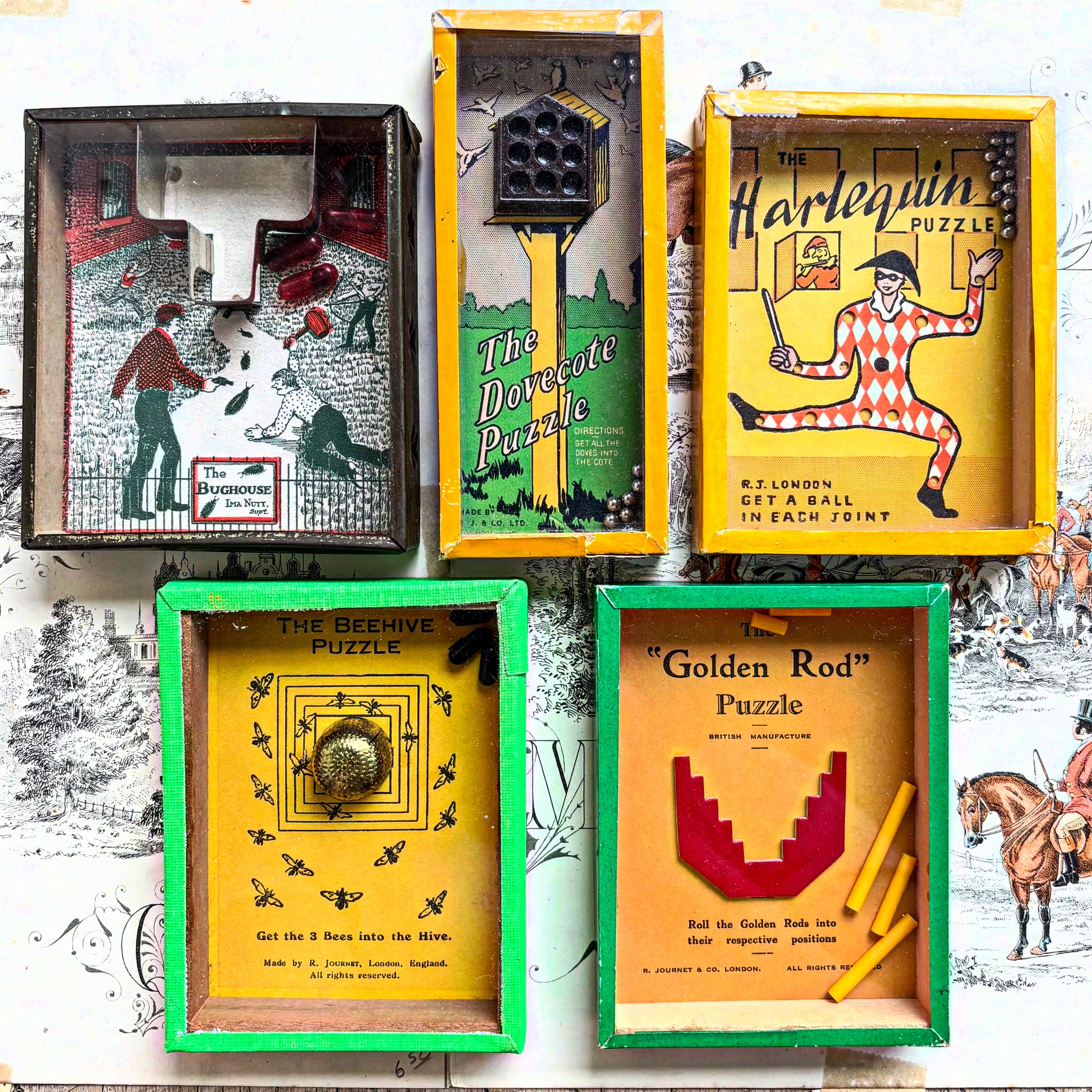 A delightful collection of mid-century games that test skill, patience, and a sense of humour. Each puzzle features bright lithographed artwork, original printed instructions, and that classic English wit that makes R. Journet puzzles so collectible.