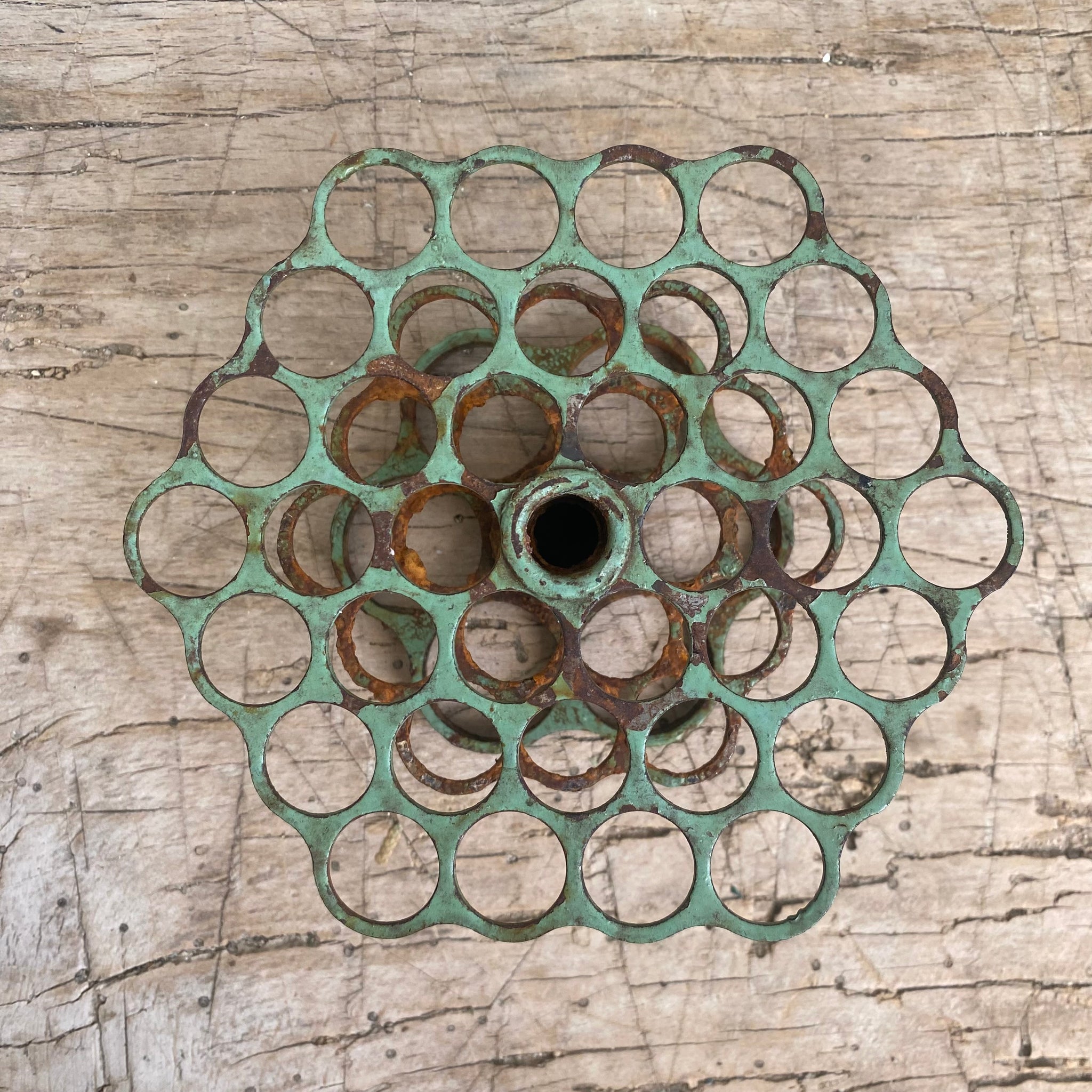 Rare Antique Industrial Honeycomb Green Metal Flower Frog. Perfect for holding flowers in a unique and decorative way. Great Industrial Design form of sturdy metal, it features multiple slots to securely hold your blooms.